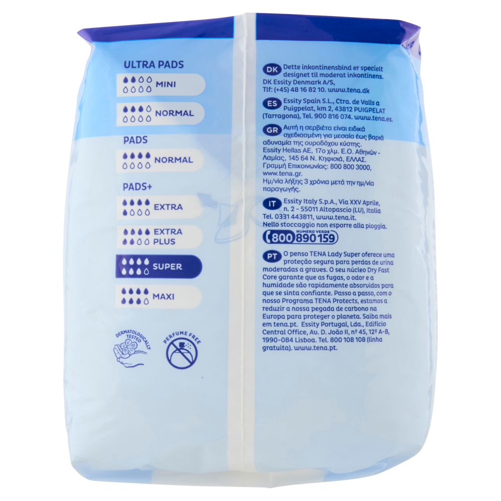 Tena Protects Program Con il nostro Programma Tena Protects vogliamo proteggere le persone e il loro benessere, anche diminuendo il nostro impatto ambientale. Dal 2008 stiamo riducendo l'impronta di carbonio delle nostre protezioni assorbenti lungo l'intero ciclo di vita del prodotto. Segui i nostri progressi su tena.it o inquadra il QR code. dedicatoame.it Ultra Pads Mini - Assorbenza 2 su 8 Normal - Assorbenza 3 su 8 Pads Normal - Assorbenza 4 su 8 Pads+ Extra - Assorbenza 5 su 8 Extra plus - Assorbenza 6 su 8 Super - Assorbenza 7 su 8 Maxi - Assorbenza 7 su 8
