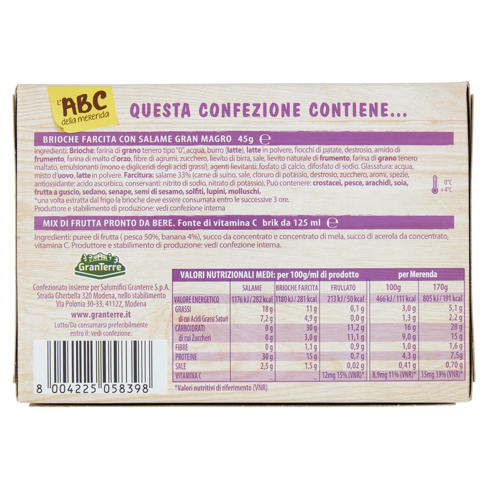 Brioche farcita con salame gran magro Produttore e stabilimento di produzione: vedi confezione interna Mix di frutta pronto da bere. Fonte di vitamina C Produttore e stabilimento di produzione: vedi confezione interna.