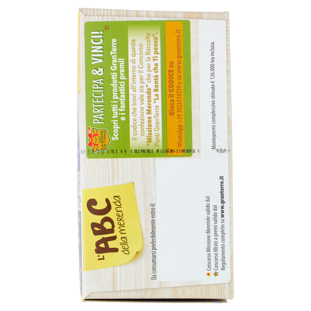Astuccio esterno per il 90% da carta riciclata La merenda completa e bilanciata studiata con l'esperto in nutrizione Dott. Giorgio Donegani Lo studio si basa sul fabbisogno di un bambino tra gli 8 e i 10 anni di consumare a merenda circa 200 kcal. Questo fabbisogno dovrebbe essere apportato in modo bilanciato: - Per il 45-60% da carboidrati - Per il 10-20% da proteine - Per il 20-35% da grassi