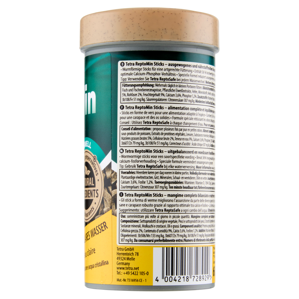 Tetra ReptoMin Sticks - mangime completo bilanciato e nutriente per tutte le tartarughe d'acqua - Gli stick a forma di verme migliorano l'assunzione da parte delle diverse specie di tartarughe - Contiene il 36% di proteine di alta qualità - Ossa sane e carapace robusto grazie al rapporto ottimale tra calcio e fosforo - La formula speciale riduce gli odori sgradevoli