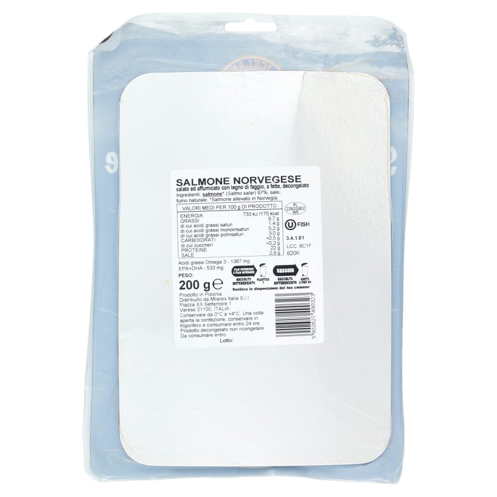 Zona di pesca Salmone allevato in Norvegia Bollo CE PL 22631802 WE Origine Altro Testo Prodotto in Polonia
