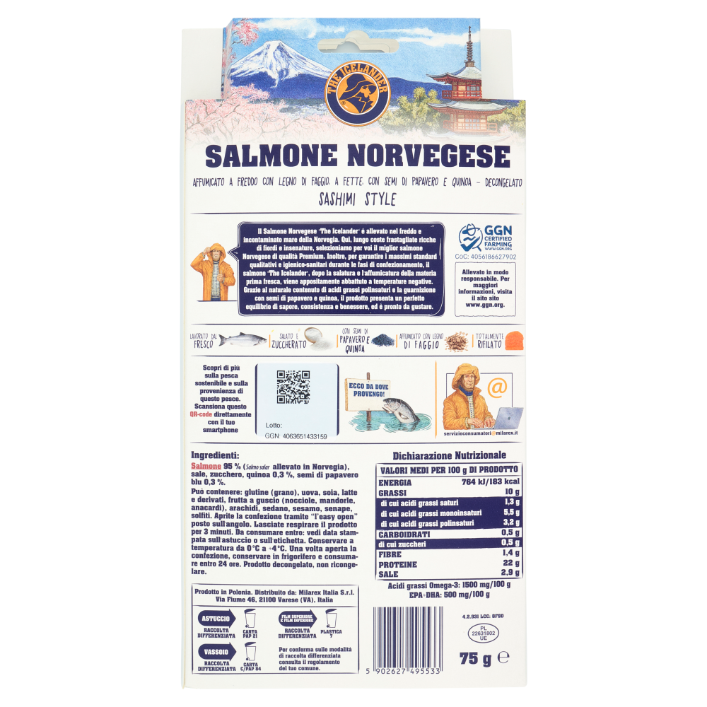 II Salmone Norvegese "The Icelander è allevato nel freddo e incontaminato mare della Norvegia. Qui, lungo coste frastagliate ricche di fiordi e insenature, selezioniamo per voi il miglior salmone Norvegese di qualità Premium. Inoltre, per garantire i massimi standard qualitativi e igienico-sanitari durante le fasi di confezionamento, il salmone "The Icelander", dopo la salatura e l'affumicatura della materia prima fresca, viene appositamente abbattuto a temperature negative. Grazie al naturale contenuto di acidi grassi polinsaturi e la guarnizione con semi di papavero e quinoa, il prodotto presenta un perfetto equilibrio di sapore, consistenza e benessere, ed è pronto da gustare. Lavorato dal fresco Salato e zuccherato Con semi di papavero e quinoa Affumicato con legno di faggio Totalmente rifilato