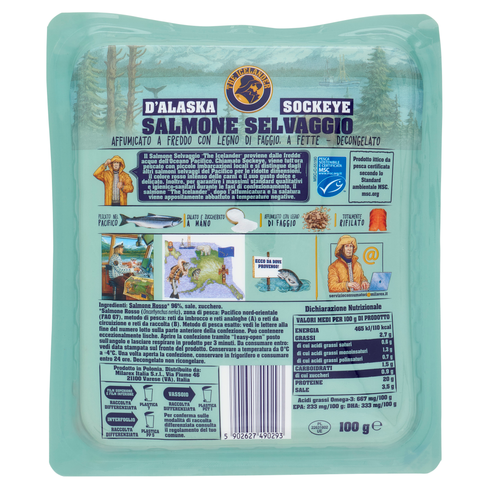 Il Salmone Selvaggio "The Icelander" proviene dalle fredde acque dell'Oceano Pacifico. Chiamato Sockeye, viene tutt'ora pescato con piccole imbarcazioni locali e sí distingue dagli altri salmoni selvaggi del Pacifico per le ridotte dimensioni, il colore rosso intenso delle carni e il suo gusto dolce e delicato. Inoltre, per garantire i massimi standard qualitativi e igienico-sanitari durante le fasi di confezionamento, il salmone "The Icelander", dopo l'affumicatura e la salatura viene appositamente abbattuto a temperature negative. Pescato nel Pacifico Salato e zuccherato a mano Affumicato con legno di faggio Totalmente rifilato