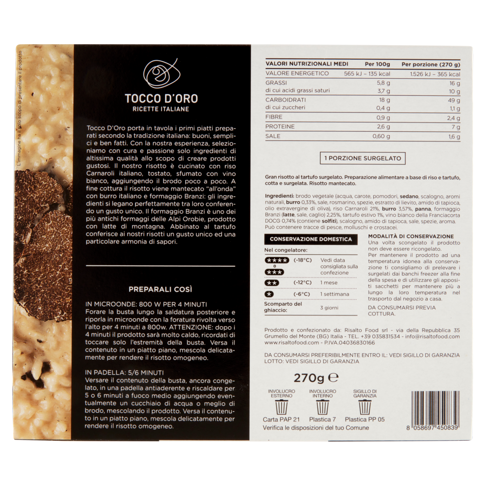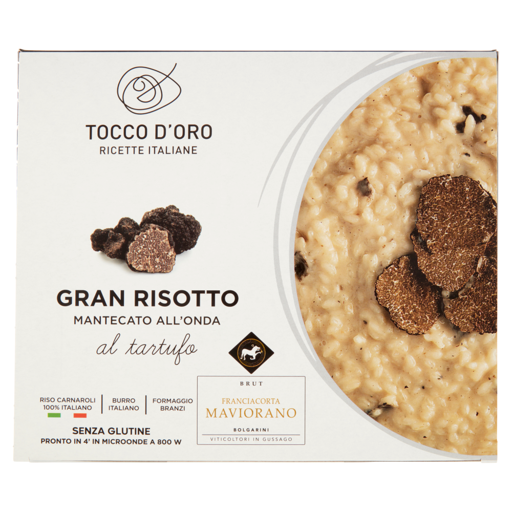 Tocco D'Oro porta in tavola i primi piatti preparati secondo la tradizione italiana: buoni, semplici e ben fatti. Con la nostra esperienza, selezioniamo con cura e passione solo ingredienti di altissima qualità allo scopo di creare prodotti gustosi. Il nostro risotto è cucinato con riso Carnaroli italiano, tostato, sfumato con vino bianco, aggiungendo il brodo poco a poco. A fine cottura il risotto viene mantecato "all'onda" con burro italiano e formaggio Branzi: gli ingredienti si legano perfettamente tra loro conferendo un gusto unico. Il formaggio Branzi è uno dei più antichi formaggi delle Alpi Orobie, prodotto con latte di montagna. Abbinato al tartufo conferisce ai nostri risotti un gusto unico ed una particolare armonia di sapori. Prodotto artigianale italiano