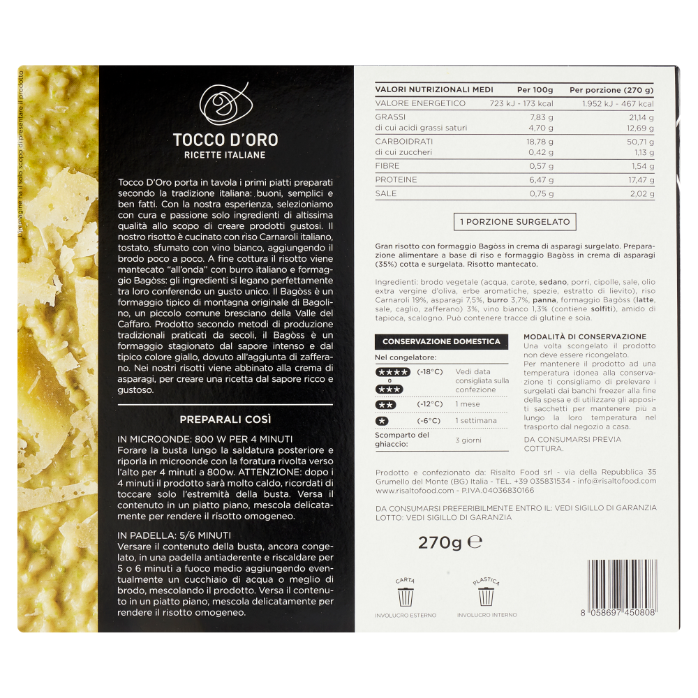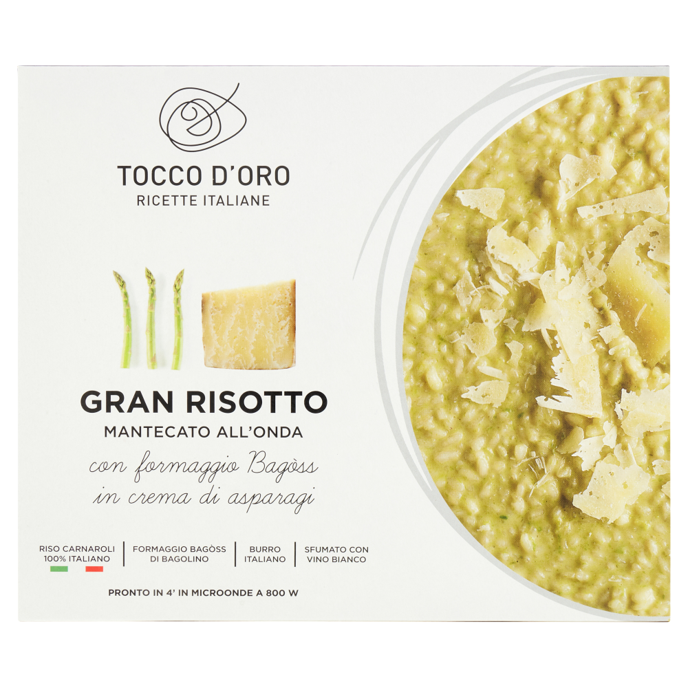 Tocco D'Oro porta in tavola i primi piatti preparati secondo la tradizione italiana: buoni, semplici e ben fatti. Con la nostra esperienza, selezioniamo con cura e passione solo ingredienti di altissima qualità allo scopo di creare prodotti gustosi. Il nostro risotto è cucinato con riso Carnaroli italiano, tostato, sfumato con vino bianco, aggiungendo il brodo poco a poco. A fine cottura il risotto viene mantecato "all'onda" con burro italiano e formaggio Bagòss: gli ingredienti si legano perfettamente tra loro conferendo un gusto unico. Il Bagòss è un formaggio tipico di montagna originale di Bagolino, un piccolo comune bresciano della Valle del Caffaro. Prodotto secondo metodi di produzione tradizionali praticati da secoli, il Bagòss è un formaggio stagionato dal sapore intenso e dal tipico colore giallo, dovuto all'aggiunta di zafferano. Nei nostri risotti viene abbinato alla crema di asparagi, per creare una ricetta dal sapore ricco e gustoso. Prodotto artigianale italiano