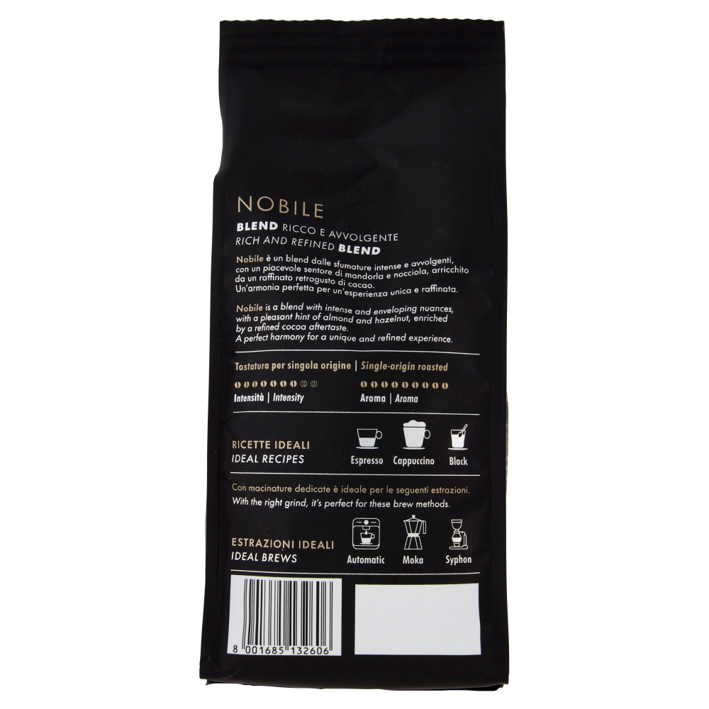 Nobile è un blend dalle sfumature intense e avvolgenti, con un piacevole sentore di mandorla e nocciola, arricchito da un raffinato retrogusto di cacao. Un'armonia perfetta per un'esperienza unica e raffinata. Tostatura per singola origine Intensità 7 su 9 Aroma 9 su 9 Ricette ideali Espresso Cappuccino Black Con macinature dedicate è ideale per le seguenti estrazioni. Estrazioni Ideali Automatic Moka Syphon