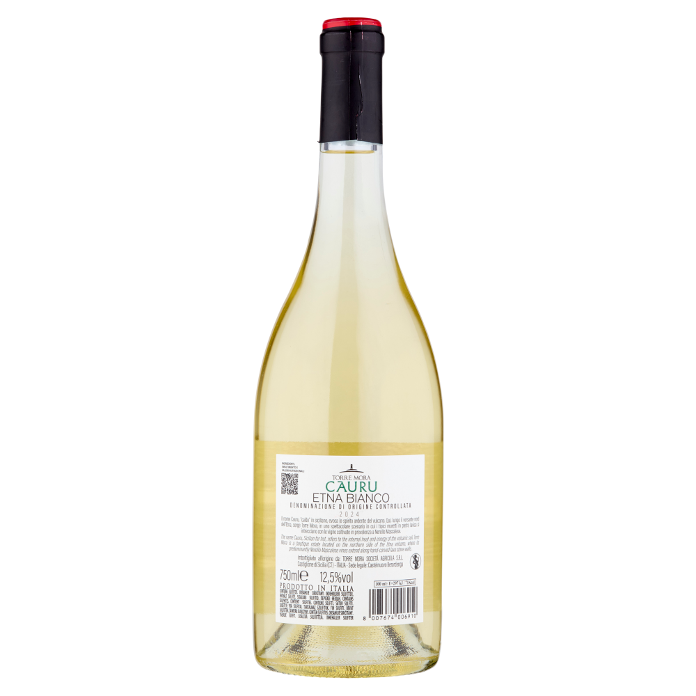 Cauru Etna Bianco DOC, vino bianco italiano. Il nome Cauru, "caldo" in siciliano, evoca lo spirito ardente del vulcano. Qui, lungo il versante nord dellEtna, sorge Torre Mora, in uno spettacolare scenario in cui i tipici muretti in pietra lavica si intrecciano con le vigne coltivate in prevalenza a Nerello Mascalese. Etna Bianco Denominazione di Origine Controllata