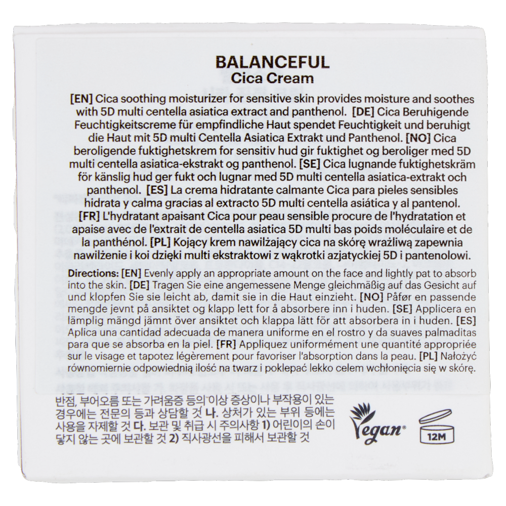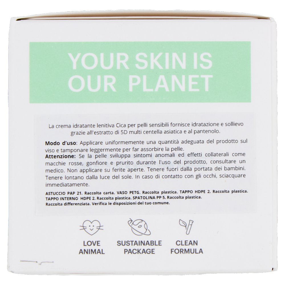 La crema idratante lenitiva Cica per pelli sensibili fornisce idratazione e sollievo grazie all'estratto di 5D multi centella asiatica e al pantenolo.