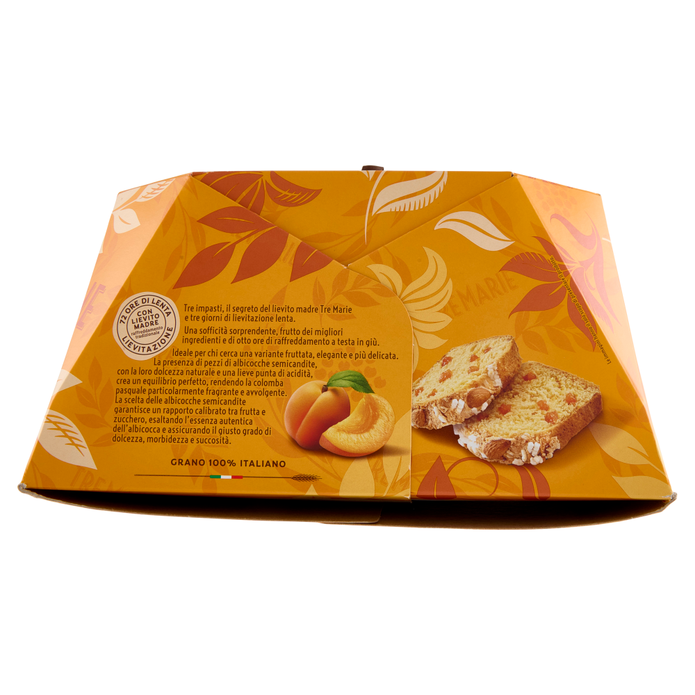 72 Ore di lenta lievitazione - Con lievito madre - raffreddamento tradizionale Tre impasti, il segreto del lievito madre Tre Marie e tre giorni di lievitazione lenta. Una sofficità sorprendente, frutto dei migliori ingredienti e di otto ore di raffreddamento a testa in giù. Ideale per chi cerca una variante fruttata, elegante e più delicata. La presenza di pezzi di albicocche semicandite, con la loro dolcezza naturale e una lieve punta di acidità, crea un equilibrio perfetto, rendendo la colomba pasquale particolarmente fragrante e avvolgente. La scelta delle albicocche semicandite garantisce un rapporto calibrato tra frutta e zucchero, esaltando l'essenza autentica dell'albicocca e assicurando il giusto grado di dolcezza, morbidezza e succosità. Grano 100% italiano