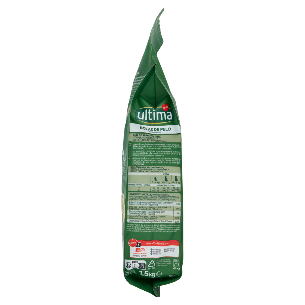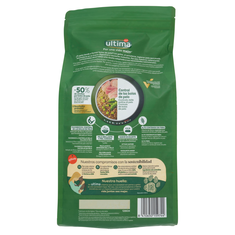 Il tuo gatto tende a formare palline di pelo? Quando si lavano, i gatti ingoiano del pelo che potrebbe accumularsi nel tratto digerente e causare fastidi. Per questo, i nostri veterinari nutrizionisti sviluppano una ricetta adattata alle loro esigenze nutrizionali. Controllo delle palline di pelo - 50% di rigurgito dovuto alle palline di pelo - Risultati dimostrati² ²Rispetto a una ricetta Ultima Gatto Adulto senza una miscela specifica di fibre vegetali - Favorisce il controllo delle palline di pelo Selezione di fibre vegetali che favorisce l'escrezione del pelo nelle feci - Pelo lucido e benessere della pelle Omega 6, biotina e zinco - Ottimo sapore Selezione di ingredienti altamente appetibili - Alto contenuto di fibra Miscela di fibre vegetali che riduce il rigurgito dovuto alle palline di pelo