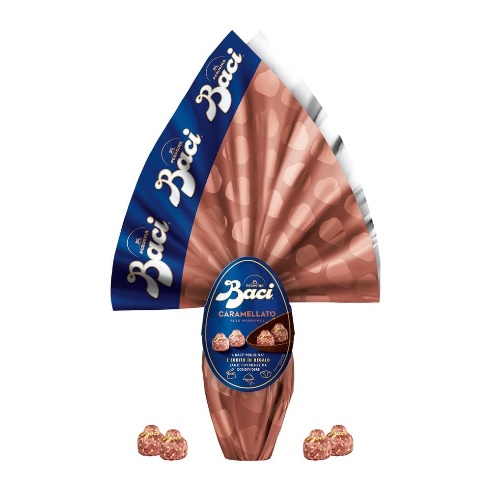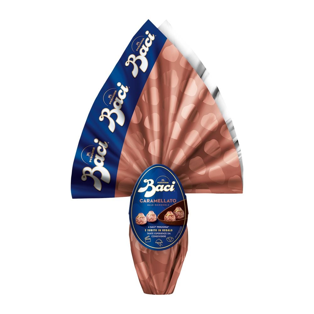 Uovo di cioccolato fondente extra al gusto caramello con granella di mandorle caramellate. Cacao: 51% minimo nel cioccolato Baci Caramellato - Pralina di cioccolato fondente extra al gusto di caramello ripieno con nocciole e mandorle