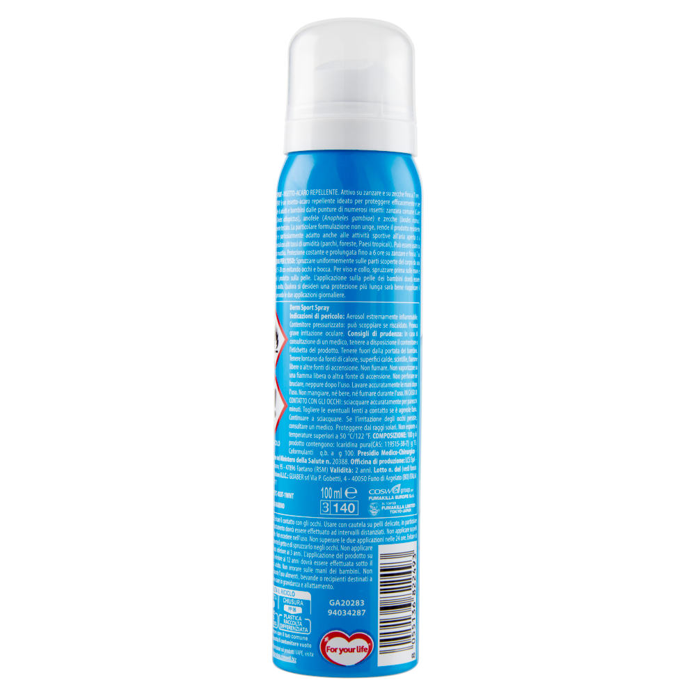 PERICOLO Derm Sport Spray Indicazioni di pericolo: Aerosol estremamente infiammabile. Contenitore pressurizzato: può scoppiare se riscaldato. Provoca grave irritazione oculare. Consigli di prudenza: In caso di consultazione di un medico, tenere a disposizione il contenitore o l'etichetta del prodotto. Tenere fuori dalla portata dei bambini. Tenere lontano da fonti di calore, superfici calde, scintille, fiamme libere o altre fonti di accensione. Non fumare. Non vaporizzare su una fiamma libera o altra fonte di accensione. Non perforare ne bruciare, neppure dopo l'uso. Lavare accuratamente le mani dopo l'uso. Non mangiare, né bere, né fumare durante l'uso. IN CASO DI CONTATTO CON GLI OCCHI: sciacquare accuratamente per parecchi minuti. Togliere le eventuali lenti a contatto se è agevole farlo. Continuare a sciacquare. Se l'irritazione degli occhi persiste, consultare un medico. Proteggere dai raggi solari. Non esporre a temperature superiori a 50 °C/122 °F. Presidio Medico-Chirurgico - Registrazione del Ministero della Salute n. 20388. UFI: AE7Y-8CYC-UC8T-1WNT AVVERTENZE: Evitare il contatto con gli occhi. Usare con cautela su pelli delicate, in particolare nei bambini il trattamento dovrà essere effettuato ad intervalli distanziati. Non applicare su pelli abrase o su ferite. Non eccedere nell'uso. Non superare le due applicazioni nelle 24 ore. Evitare di inalare direttamente il getto e di spruzzarlo negli occhi. Non applicare sui bambini di età inferiore ai 3 anni. L'applicazione del prodotto su bambini di età inferiore ai 12 anni dovrà essere effettuata sotto il controllo di un adulto. Non irrorare sulle mani dei bambini. Non contaminare durante l'uso alimenti, bevande o recipienti destinati a contenerne. Non usare in gravidanza e allattamento.