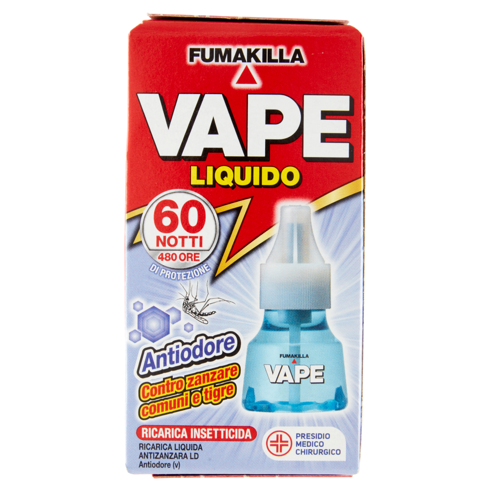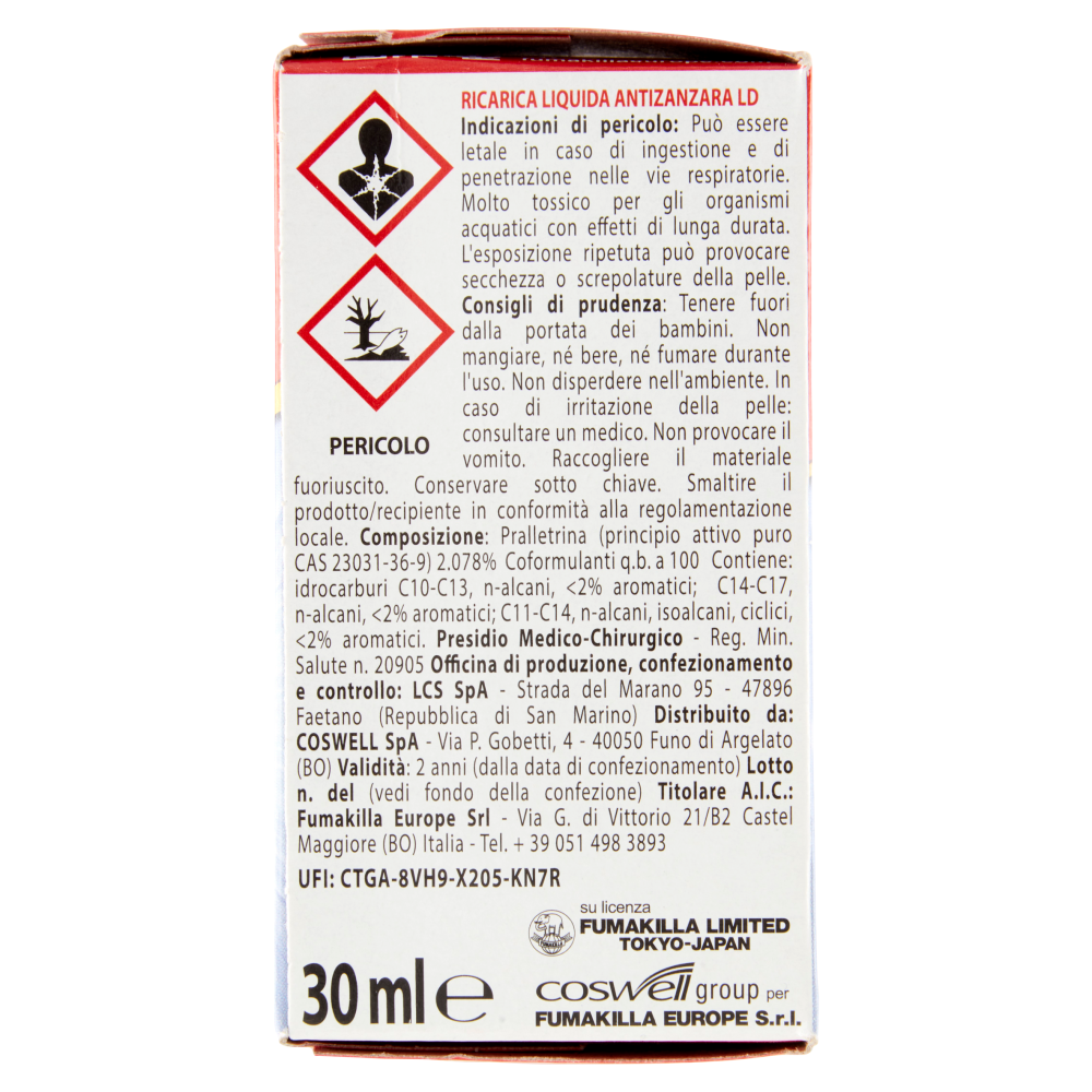 AVVERTENZE - Non toccare l'apparecchio quando è in funzione. Non tenere l'elettroemanatore in funzione a contatto con tessuti, carta o altri materiali combustibili. Se il prodotto viene usato dove si soggiorna lungamente e nelle camere da letto è bene aerare il locale prima di soggiornarvi nuovamente. Non mantenere in funzione l'apparecchio quando si soggiorna in ambienti chiusi. È sconsigliata l'esposizione continua a persone sensibili (bambini, asmatici, ecc.). Non contaminare alimenti e bevande o recipienti atti a contenerne. Conservare lontano da alimenti e bevande. PERICOLO Ricarica liquida antizanzara LD Indicazioni di pericolo: Può essere letale in caso di ingestione e di penetrazione nelle vie respiratorie. Molto tossico per gli organismi acquatici con effetti di lunga durata. L'esposizione ripetuta può provocare secchezza o screpolature della pelle. Consigli di prudenza: Tenere fuori dalla portata dei bambini. Non mangiare, né bere, né fumare durante l'uso. Non disperdere nell'ambiente. In caso di irritazione della pelle: consultare un medico. Non provocare il vomito. Raccogliere il materiale fuoriuscito. Conservare sotto chiave. Smaltire il prodotto/recipiente in conformità alla regolamentazione locale. Contiene: idrocarburi C10-C13, n-alcani, <2% aromatici; C14-C17, n-alcani, <2% aromatici; C11-C14, n-alcani, isoalcani, ciclici, <2% aromatici. Presidio Medico-Chirurgico - Reg. Min. Salute n. 20905 UFI: CTGA-8VH9-X205-KN7R