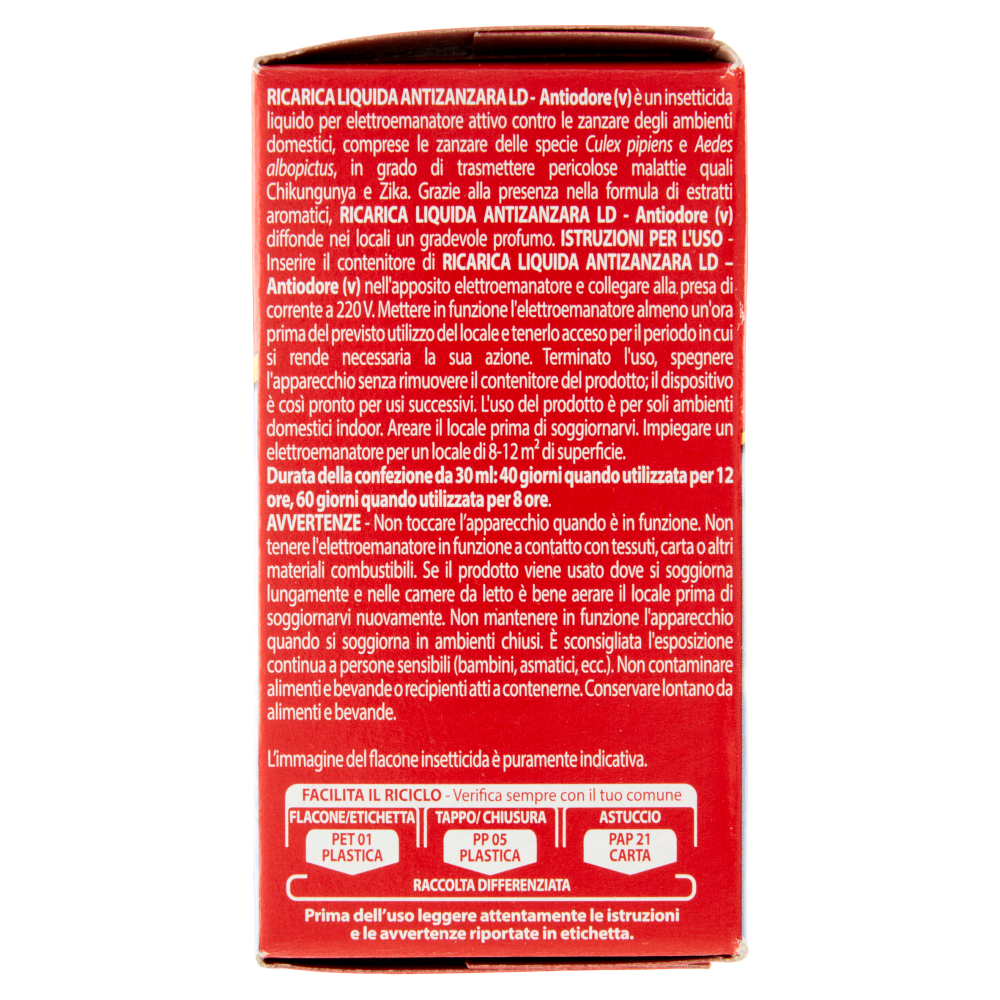 Prima dell'uso leggere attentamente le istruzioni e le avvertenze riportate in etichetta. Istruzioni per l'uso - Inserire il contenitore di ricarica liquida antizanzara LD - Antiodore (v) nell'apposito elettroemanatore e collegare alla presa di corrente a 220 V. Mettere in funzione l'elettroemanatore almeno un'ora prima del previsto utilizzo del locale e tenerlo acceso per il periodo in cui si rende necessaria la sua azione. Terminato l'uso, spegnere l'apparecchio senza rimuovere il contenitore del prodotto; il dispositivo è così pronto per usi successivi. L'uso del prodotto è per soli ambienti domestici indoor. Areare il locale prima di soggiornarvi. Impiegare un elettroemanatore per un locale di 8-12 m² di superficie. Durata della confezione da 30 ml: 40 giorni quando utilizzata per 12 ore, 60 giorni quando utilizzata per 8 ore.