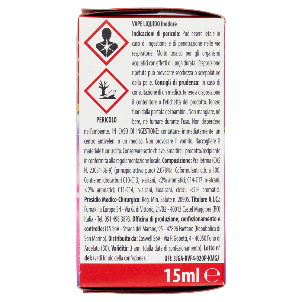 AVVERTENZE: Non toccare l'apparecchio quando è in funzione. Non tenere il diffusore in funzione a contatto con tessuti, carta o altri materiali combustibili. Se il prodotto viene usato dove si soggiorna lungamente e nelle camere da letto è bene aerare il locale prima di soggiornarvi nuovamente. Non mantenere in funzione l'apparecchio quando si soggiorna in ambienti chiusi. È sconsigliata l'esposizione continua a persone sensibili (bambini, asmatici, ecc.). Non contaminare alimenti e bevande o recipienti atti a contenerne. Conservare lontano da alimenti e bevande. Prima dell'uso leggere attentamente le istruzioni e le avvertenze riportate in etichetta. Indicazioni di pericolo: Può essere letale in caso di ingestione e di penetrazione nelle vie respiratorie. Molto tossico per gli organismi acquatici con effetti di lunga durata. L'esposizione ripetuta può provocare secchezza o screpolature della pelle. PERICOLO Vape Liquido Inodore Indicazioni di pericolo: Può essere letale in caso di ingestione e di penetrazione nelle vie respiratorie. Molto tossico per gli organismi acquatici con effetti di lunga durata. L'esposizione ripetuta può provocare secchezza o screpolature della pelle. Consigli di prudenza: In caso di consultazione di un medico, tenere a disposizione il contenitore o l'etichetta del prodotto. Tenere fuori dalla portata dei bambini. Non mangiare, né bere, né fumare durante l'uso. Non disperdere nell'ambiente. IN CASO DI INGESTIONE: contattare immediatamente un centro antiveleni o un medico. Non provocare il vomito. Raccogliere il materiale fuoriuscito. Conservare sotto chiave. Smaltire il prodotto/recipiente in conformità alla regolamentazione locale. Presidio Medico-Chirurgico: Reg. min. salute n. 20905. UFI: 3JGA-RVF4-020P-KMGJ