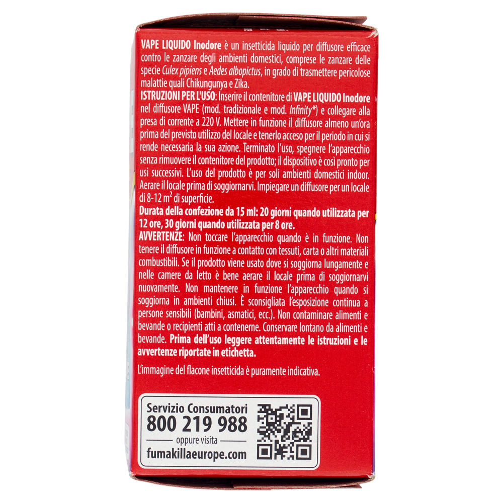Istruzioni per l'uso: Inserire il contenitore di Vape Liquido Inodore nel diffusore Vape (mod. tradizionale e mod. Infinity) e collegare alla presa di corrente a 220 V. Mettere in funzione il diffusore almeno un'ora prima del previsto utilizzo del locale e tenerlo acceso per il periodo in cui si rende necessaria la sua azione. Terminato l'uso, spegnere l'apparecchio senza rimuovere il contenitore del prodotto; il dispositivo è così pronto per usi successivi. L'uso del prodotto è per soli ambienti domestici indoor. Aerare il locale prima di soggiornarvi. Impiegare un diffusore per un locale di 8-12 m² di superficie. Durata della confezione da 15 ml: 20 giorni quando utilizzata per 12 ore, 30 giorni quando utilizzata per 8 ore.
