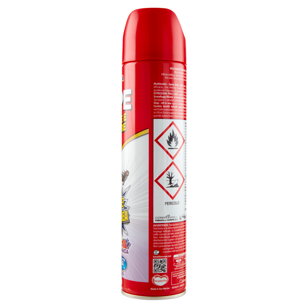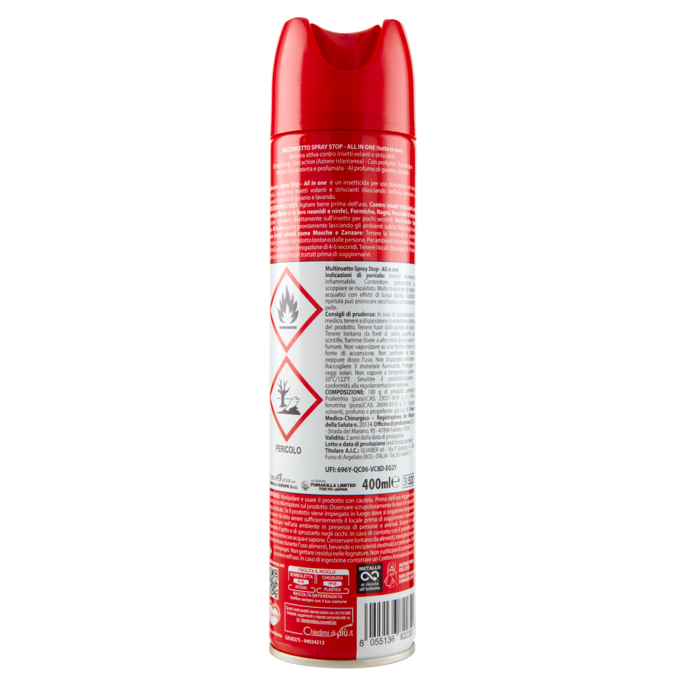 PERICOLO Multinsetto Spray Stop - All in one Indicazioni di pericolo: Aerosol estremamente infiammabile. Contenitore pressurizzato: può scoppiare se riscaldato. Molto tossico per gli organismi acquatici con effetti di lunga durata. L'esposizione ripetuta può provocare secchezza o screpolature della pelle. Consigli di prudenza: In caso di consultazione di un medico, tenere a disposizione il contenitore o l'etichetta del prodotto. Tenere fuori dalla portata dei bambini. Tenere lontano da fonti di calore, superfici calde, scintille, fiamme libere o altre fonti di accensione. Non fumare. Non vaporizzare su una fiamma libera o altra fonte di accensione. Non perforare né bruciare, neppure dopo l'uso. Non disperdere nell'ambiente. Raccogliere il materiale fuoriuscito. Proteggere dai raggi solari. Non esporre a temperature superiori a 50°C/122°F. Smaltire il prodotto/recipiente in conformità alla regolamentazione nazionale. Presidio Medico-Chirurgico - Registrazione del Ministero della Salute n. 20534. UFI: 696Y-QC06-VC8D-EG2Y AVVERTENZE: Manipolare e usare il prodotto con cautela. Prima dell'uso leggere sempre l'etichetta e le informazioni sul prodotto. Osservare scrupolosamente le dosi e le modalità di impiego indicate. Se il prodotto viene impiegato in luogo dove si soggiorna lungamente o nelle camere da letto aerare sufficientemente il locale prima di soggiornarvi nuovamente. Non nebulizzare nell'aria ambiente in presenza di persone o animali. Evitare di inalare direttamente il getto e di spruzzarlo negli occhi. In caso di contatto con il prodotto, lavarsi abbondantemente con acqua e sapone. Conservare lontano da alimenti, mangimi e bevande. Non contaminare durante l'uso alimenti, bevande o recipienti destinati a contenerne. Evitare usi impropri. Non gettare i residui nelle fognature. Non riutilizzare il contenitore. Non eccedere nell'uso. In caso di ingestione contattare un Centro Antiveleni/medico.