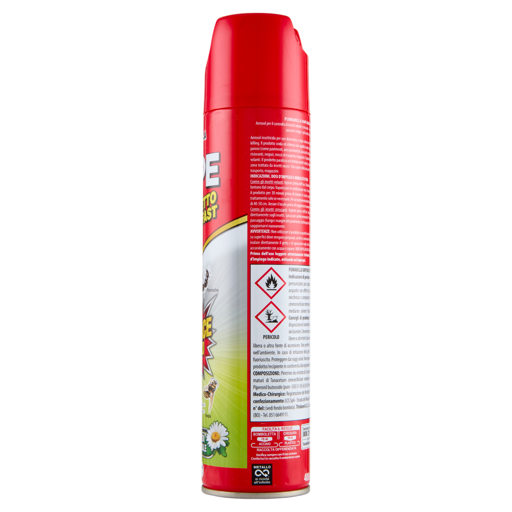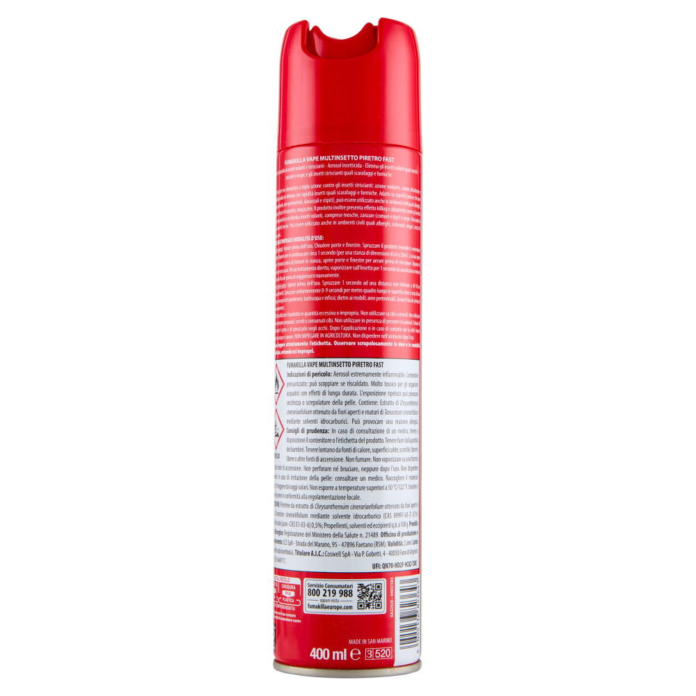 AVVERTENZE: Non utilizzare il prodotto in quantità eccessiva o impropria. Non utilizzare su cibi o utensili. Non utilizzare su superfici dove vengono preparati, serviti o consumati cibi. Non utilizzare in presenza di persone e/o animali. Evitare di inalare direttamente il getto e di spruzzarlo negli occhi. Dopo l'applicazione o in caso di contatto con la pelle lavarsi accuratamente con acqua e sapone. NON IMPIEGARE IN AGRICOLTURA. Non disperdere nell'ambiente dopo l'uso. Prima dell'uso leggere attentamente l'etichetta. Osservare scrupolosamente le dosi e le modalità d'impiego indicate, evitando usi impropri. PERICOLO Fumakilla Vape multinsetto piretro fast Indicazioni di pericolo: Aerosol estremamente infiammabile. Contenitore pressurizzato: può scoppiare se riscaldato. Molto tossico per gli organismi acquatici con effetti di lunga durata. L'esposizione ripetuta può provocare secchezza o screpolature della pelle. Contiene: Estratto di Chrysanthemum cinerariaefolium ottenuto da fiori aperti e maturi di Tanacetum cinerariaefolium mediante solventi idrocarburici. Può provocare una reazione allergica. Consigli di prudenza: In caso di consultazione di un medico, tenere a disposizione il contenitore o l'etichetta del prodotto. Tenere fuori dalla portata dei bambini. Tenere lontano da fonti di calore, superfici calde, scintille, fiamme libere o altra fonte di accensione. Non fumare. Non vaporizzare su una fiamma libera o altra fonte di accensione. Non perforare né bruciare, neppure dopo l'uso. Non disperdere nell'ambiente. In caso di irritazione della pelle: consultare un medico. Raccogliere il materiale fuoriuscito. Proteggere dai raggi solari. Non esporre a temperature superiori a 50°C/122°F. Smaltire il prodotto/recipiente in conformità alla regolamentazione locale. Presidio Medico-Chirurgico: Registrazione del Ministero della Salute n. 21489. UFI: QN70-HD2F-9C82-TJKE