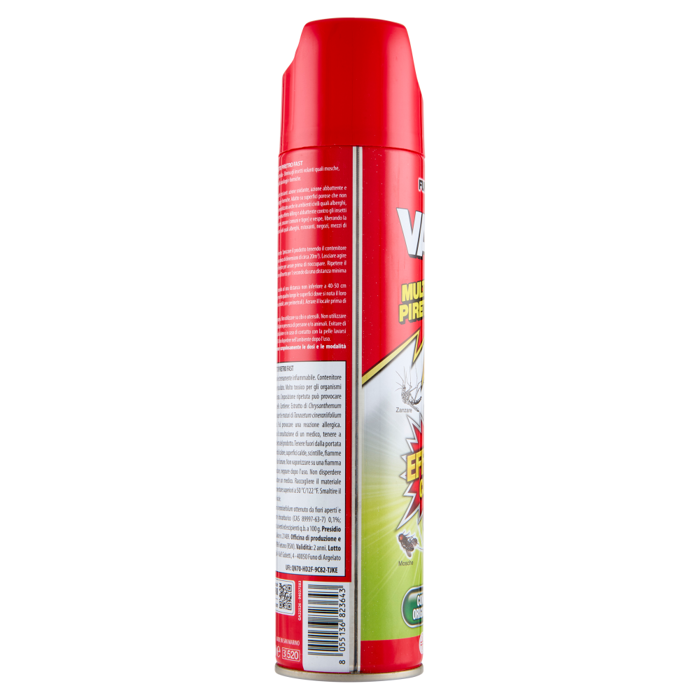 Indicazioni, dosi d'impiego e modalità d'uso: Contro gli insetti volanti: Agitare prima dell'uso. Chiudere porte e finestre. Spruzzare il prodotto tenendo il contenitore lontano dal corpo. Vaporizzare in continuo per circa 1 secondo (per una stanza di dimensioni di circa 20m³). Lasciare agire il prodotto per 30 minuti prima di tornare in stanza; aprire porte e finestre per aerare prima di rioccupare. Ripetere il trattamento solo se necessario. Per un trattamento diretto, vaporizzare sull'insetto per 1 secondo da una distanza minima di 40-50 cm. Aerare il locale prima di soggiornarvi nuovamente. Contro gli insetti striscianti: Agitare prima dell'uso. Spruzzare 1 secondo ad una distanza non inferiore a 40-50 cm direttamente sugli insetti. Spruzzare uniformemente 8-9 secondi per metro quadro lungo le superfici dove si nota il loro passaggio (lungo i margini del pavimento, battiscopa e infissi; dietro ai mobili; aree perimetrali). Aerare il locale prima di soggiornarvi nuovamente.