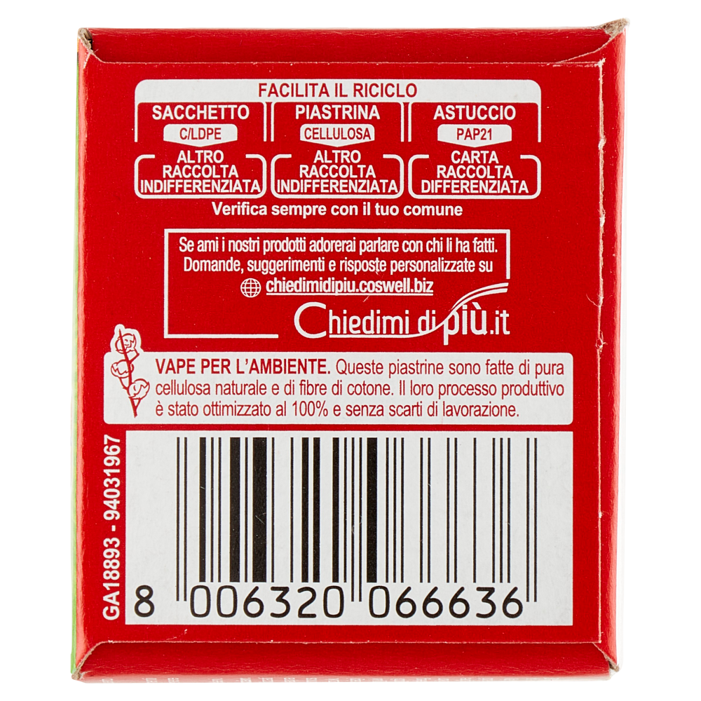 Vape per l'Ambiente. Queste piastrine sono fatte di pura cellulosa naturale e di fibre di cotone. Il loro processo produttivo è stato ottimizzato al 100% e senza scarti di lavorazione. Una piastrina Vape Mat "e" dura 12 ore senza perdere efficacia. Protegge dalle zanzare comuni e tigre (Culex pipiens - Aedes aegypti - Aedes albopictus) esplicando un'azione insetticida in ambienti chiusi e luoghi all'aperto (balconi, portici, ecc).