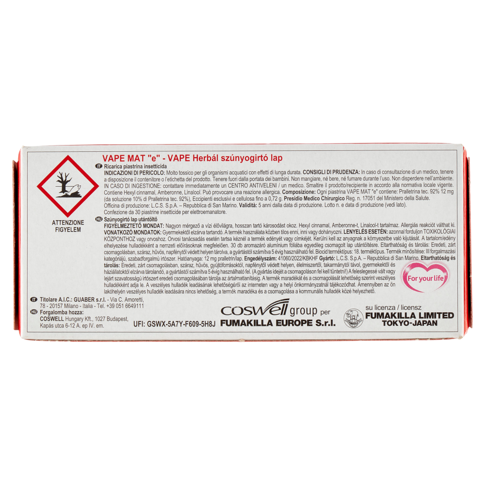 Officina di produzione: L.C.S. S.p.A. Repubblica di San Marino Titolare A.I.C.: Guaber s.r.l. Via C. Amoretti, 78 20157 Milano Italia coswell group per Fumakilla Europe S.r.l. su licenza Fumakilla Limited Tokyo Japan