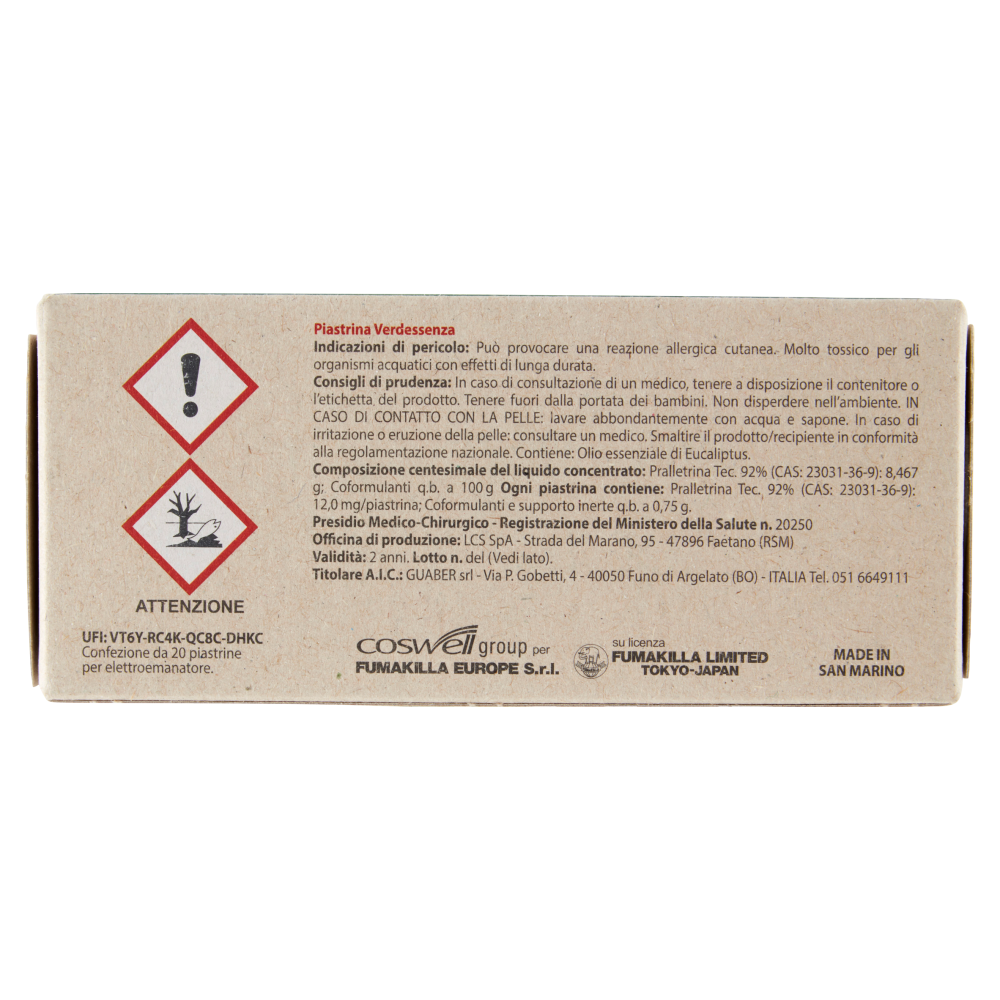 ATTENZIONE Piastrina Verdessenza Indicazioni di pericolo: Può provocare una reazione allergica cutanea. Molto tossico per gli organismi acquatici con effetti di lunga durata. Consigli di prudenza: In caso di consultazione di un medico, tenere a disposizione il contenitore o l'etichetta del prodotto. Tenere fuori dalla portata dei bambini. Non disperdere nell'ambiente. IN CASO DI CONTATTO CON LA PELLE: lavare abbondantemente con acqua e sapone. In caso di irritazione o eruzione della pelle: consultare un medico. Smaltire il prodotto/recipiente in conformità alla regolamentazione nazionale. Contiene: Olio essenziale di Eucaliptus. Presidio Medico-Chirurgico - Registrazione del Ministero della Salute n. 20250 UFI: VT6Y-RC4K-QC8C-DHKC PRECAUZIONI D'USO: Leggere attentamente l'etichetta prima dell'uso. Evitare il contatto con gli occhi. IN CASO DI CONTATTO CON LA PELLE: lavare abbondantemente con acqua e sapone. Evitare di respirare i fumi. Non tenere in funzione l'apparecchio durante la permanenza in ambienti chiusi e aerare il locale prima di soggiornarvi nuovamente - Se il prodotto viene impiegato in luogo dove si soggiorna lungamente o nelle camere da letto aerare sufficientemente il locale prima di soggiornarvi nuovamente. Conservare lontano da alimenti, mangimi e bevande. Non mangiare; né bere, né fumare durante l'uso - Evitare l'esposizione continua a persone sensibili (bambini, asmatici, ecc.) - Non toccare la piastra riscaldante durante e subito dopo l'uso onde evitare possibili scottature - Non tenere l'elettro-emanatore a contatto con tessuti o materiali combustibili in genere quando è in funzione. INFORMAZIONI PER IL MEDICO: Il prodotto contiene Pralletrina (piretroide di sintesi), i cui sintomi si riferiscono ad un blocco della trasmissione nervosa. TERAPIA: sintomatica in caso di ingestione - Consultare un Centro Antiveleni.