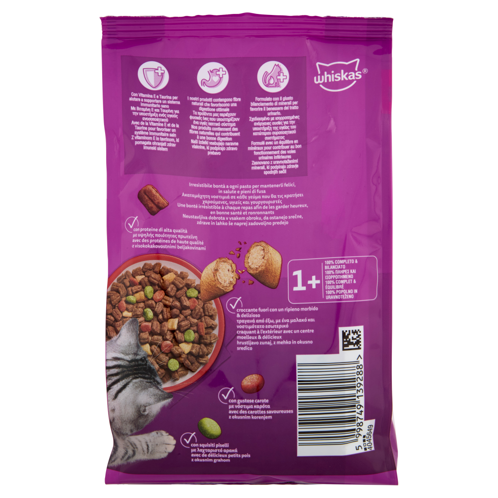 Con Vitamina E e Taurina per aiutare a supportare un sistema immunitario sano I nostri prodotti contengono fibre naturali che favoriscono una digestione ottimale Formulato con il giusto bilanciamento di minerali per favorire il benessere del tratto urinario. Irresistibile bontà a ogni pasto per mantenerli felici, in salute e pieni di fusa - con proteine di alta qualità - croccante fuori con un ripieno morbido & delizioso - con gustose carote - con squisiti piselli 1+ | 100% Completo & bilanciato