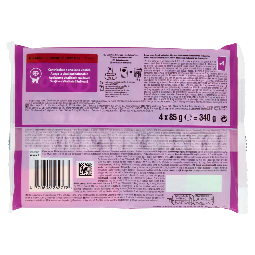 Quantità d'impiego e modalità d'uso: 62 kcal/85 g Busta = 16 g Alimento secco 1x Busta può essere sostituita da 16 g di alimento secco Whiskas. Un gatto di 3 kg necessita di 2½ - 3 buste al giorno, un gatto di 4 kg necessita di 3½ - 4 buste al giorno, un gatto di 5 kg necessita di 4 - 4½ buste al giorno. Calcolare le calorie derivanti dagli snack. Regola la quantità di alimento in base alle esigenze del tuo gatto. Come? Visita il nostro sito. Lasciare sempre a disposizione dell'acqua fresca. Servire a temperatura ambiente, conservare in frigorifero per 2 giorni.