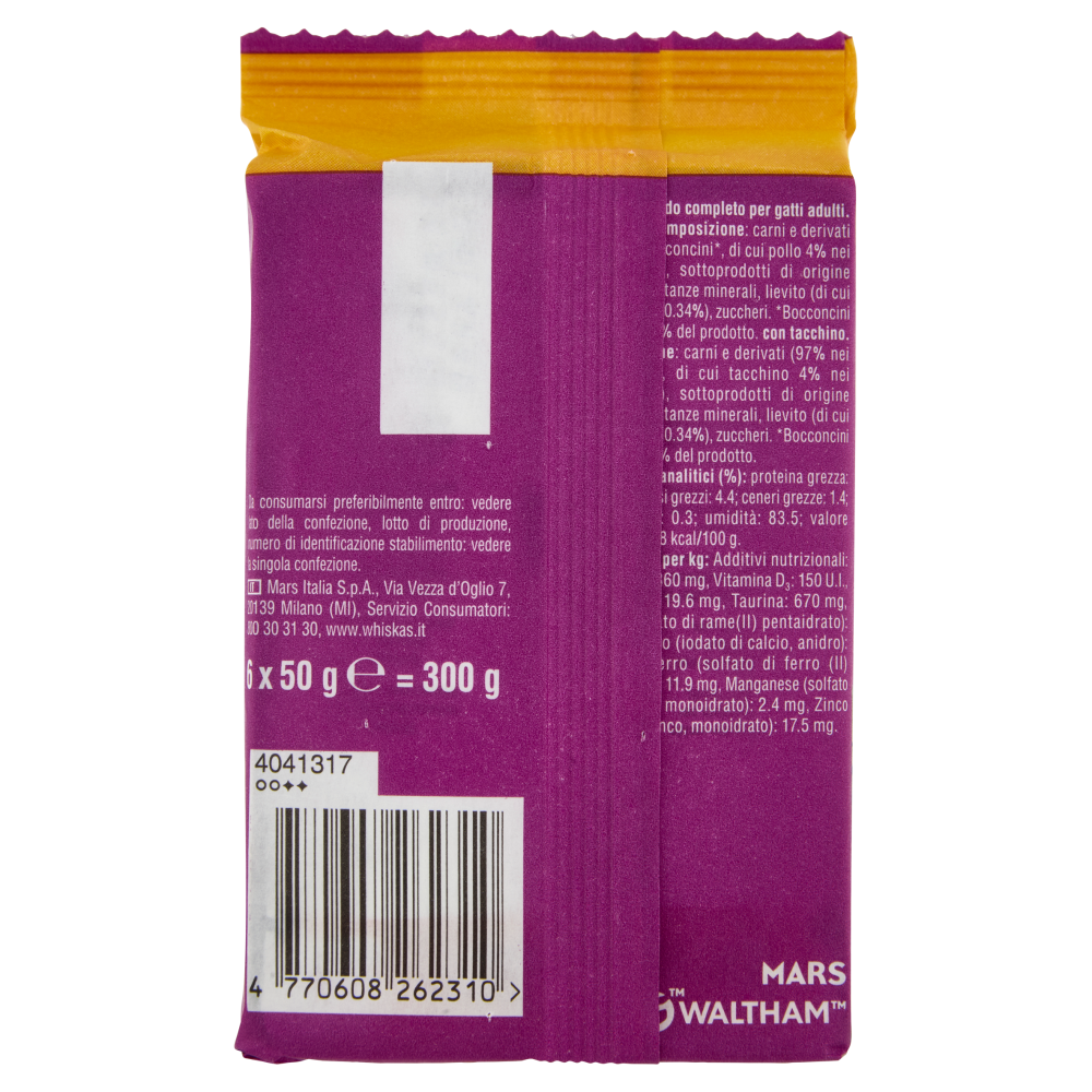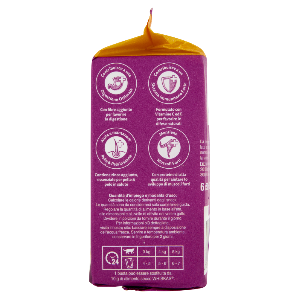 Quantità d'impiego e modalità d'uso: Calcolare le calorie derivanti dagli snack. Le quantità sono da considerarsi solo come linee guida. Regolare la quantità di alimento in base all'età, alle dimensioni e al livello di attività del vostro gatto. Dividere in porzioni da fornire durante il giorno. Per informazioni più dettagliate, visita il nostro sito. Lasciare sempre a disposizione dell'acqua fresca. Servire a temperatura ambiente, conservare in frigorifero per 2 giorni. 24h Peso del gatto: 3 kg | Buste: 4 - 5 Peso del gatto: 4 kg | Buste: 5 - 6 Peso del gatto: 5 kg | Buste: 6 - 7 1 busta può essere sostituita da 10 g di alimento secco Whiskas.