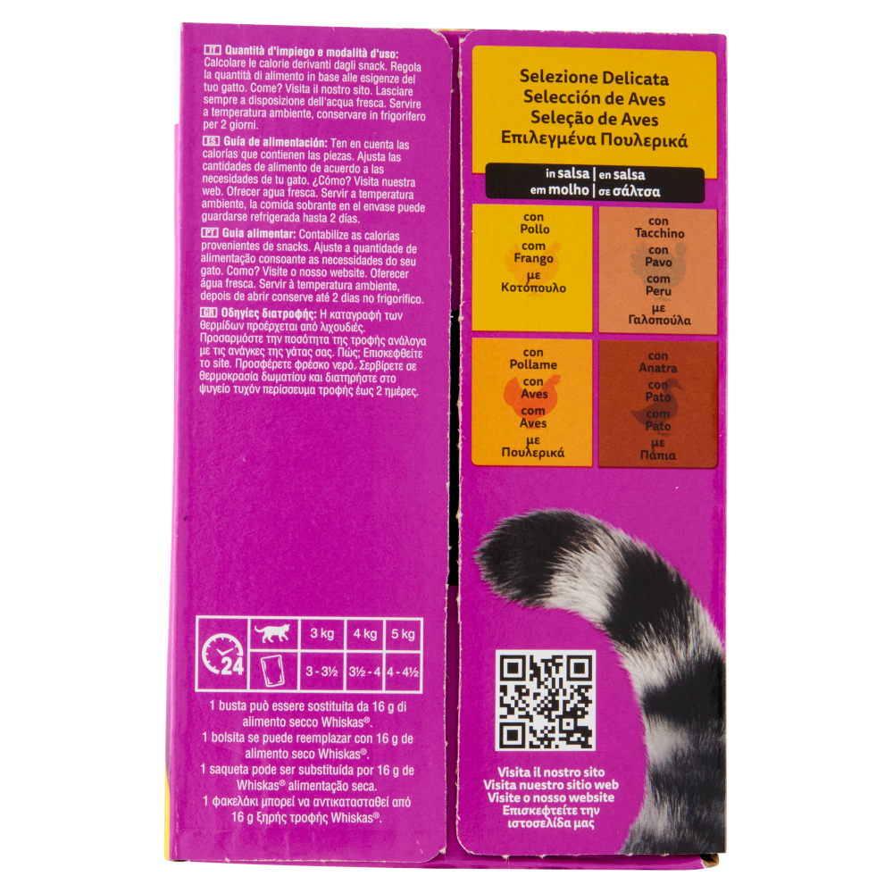 Quantità d'impiego e modalità d'uso: Calcolare le calorie derivanti dagli snack. Regola la quantità di alimento in base alle esigenze del tuo gatto. Come? Visita il nostro sito. Lasciare sempre a disposizione dell'acqua fresca. Servire a temperatura ambiente, conservare in frigorifero per 2 giorni. 24h Peso del gatto: 3 kg | Buste: 3 - 3½ Peso del gatto: 4 kg | Buste: 3½ - 4 Peso del gatto: 5 kg | Buste: 4 - 4½ 1 busta può essere sostituita da 16 g di alimento secco Whiskas.