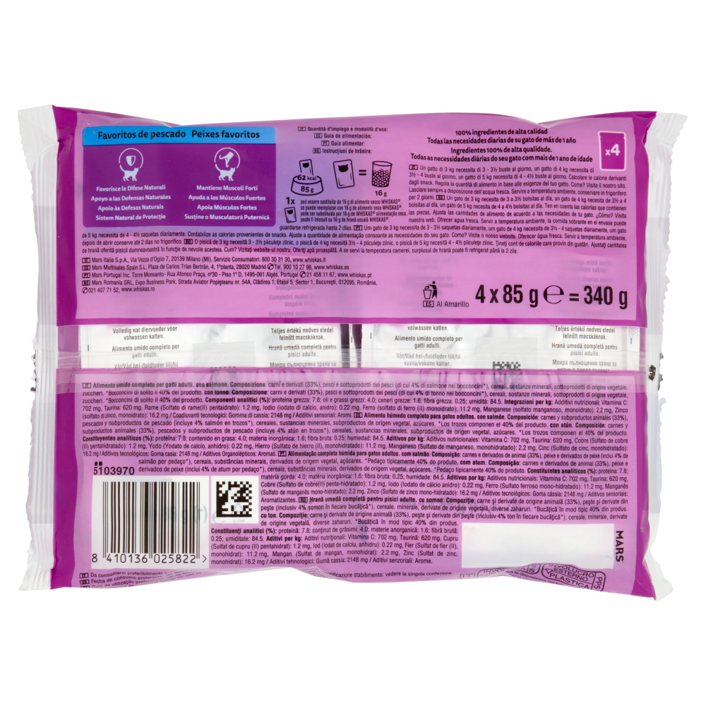 Quantità d'impiego e modalità d'uso: 62 kcal/85 g Busta = 16 g Alimento secco 1x Busta può essere sostituita da 16 g di alimento secco Whiskas. Un gatto di 3 kg necessita di 3 - 3½ buste al giorno, un gatto di 4 kg necessita di 3½ - 4 buste al giorno, un gatto di 5 kg necessita di 4 - 4½ buste al giorno. Calcolare le calorie derivanti dagli snack. Regola la quantità di alimento in base alle esigenze del tuo gatto. Come? Visita il nostro sito. Lasciare sempre a disposizione dell'acqua fresca. Servire a temperatura ambiente, conservare in frigorifero per 2 giorni.