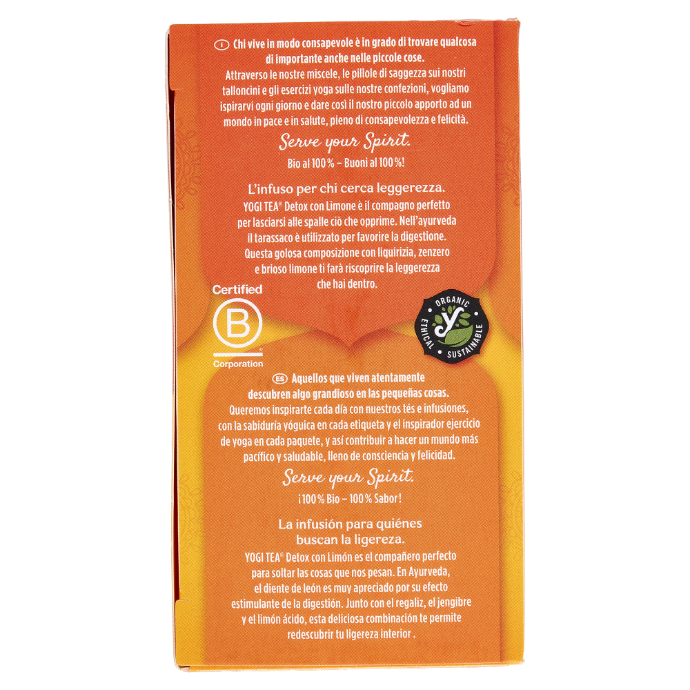 L'infuso per chi cerca leggerezza. Yogi Tea Detox con Limone è il compagno perfetto per lasciarsi alle spalle ciò che opprime. Nell'ayurveda il tarassaco è utilizzato per favorire la digestione. Questa golosa composizione con liquirizia, zenzero e brioso limone ti farà riscoprire la leggerezza che hai dentro.