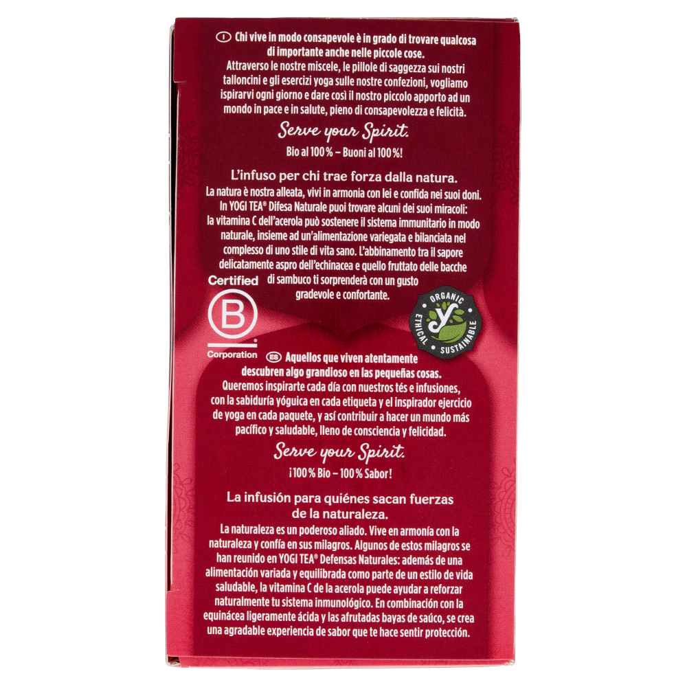 L'infuso per chi trae forza dalla natura. La natura è nostra alleata, vivi in armonia con lei e confida nei suoi doni. In Yogi Tea Difesa Naturale puoi trovare alcuni dei suoi miracoli: la vitamina C dell'acerola può sostenere il sistema immunitario in modo naturale, insieme ad un'alimentazione variegata e bilanciata nel complesso di uno stile di vita sano. L'abbinamento tra il sapore delicatamente aspro dell'echinacea e quello fruttato delle bacche di sambuco ti sorprenderà con un gusto gradevole e confortante.