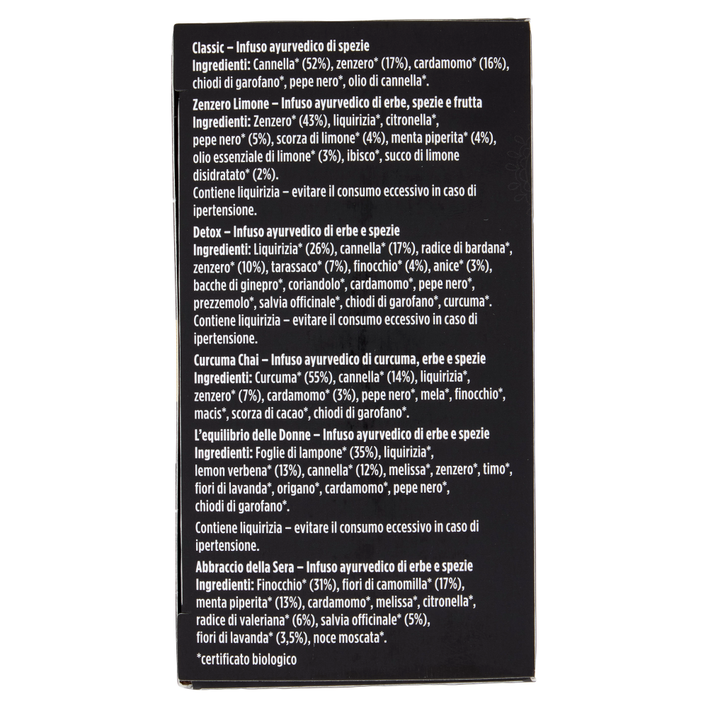 Senza glutineClassic - Infuso ayurvedico di spezie Zenzero Limone - Infuso ayurvedico di erbe, spezie e frutta Detox - Infuso ayurvedico di erbe e spezie Curcuma Chai - Infuso ayurvedico di curcuma, erbe e spezie L'equilibrio delle Donne - Infuso ayurvedico di erbe e spezie Abbraccio della Sera - Infuso ayurvedico di erbe e spezie