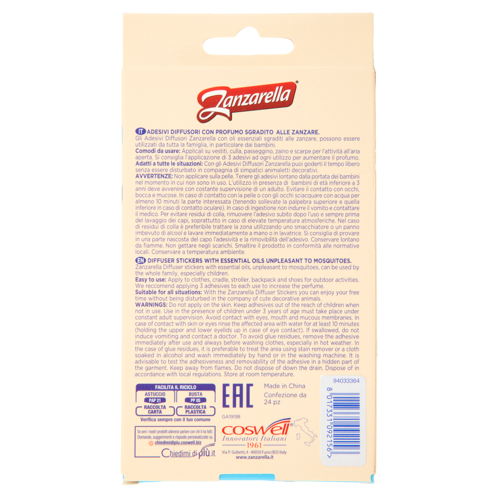 Gli Adesivi Diffusori Zanzarella con oli essenziali sgraditi alle zanzare, possono essere utilizzati da tutta la famiglia, in particolare dai bambini. Adatti a tutte le situazioni: Con gli Adesivi Diffusori Zanzarella puoi goderti il tempo libero senza essere disturbato in compagnia di simpatici animaletti decorativi.