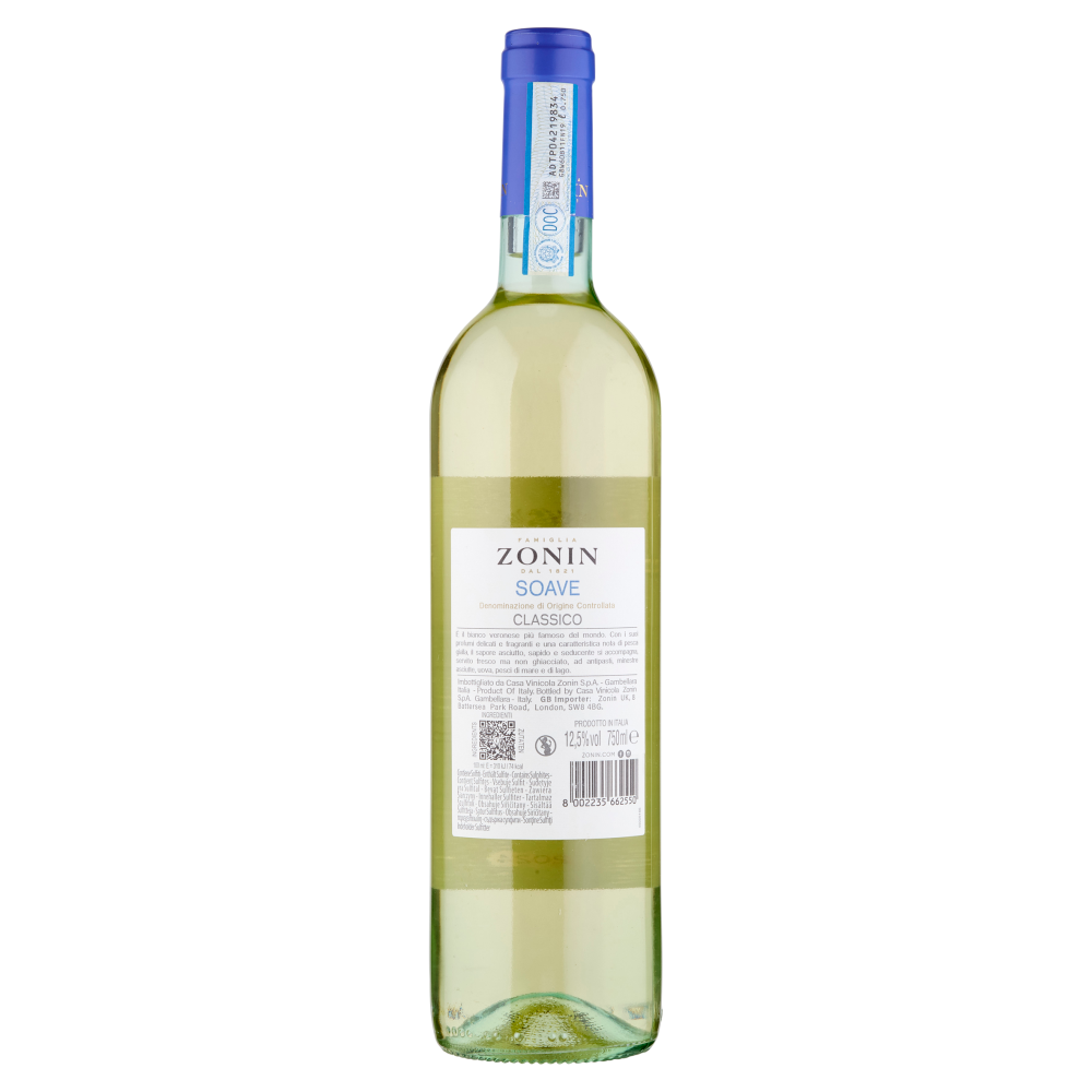 Soave DOC Classico, vino bianco italiano. É il bianco veronese più famoso del mondo. Con i suoi profumi delicati e fragranti e una caratteristica nota di pesca gialla, il sapore asciutto, sapido e seducente si accompagna, servito fresco ma non ghiacciato, ad antipasti, minestre asciutte, uova, pesci di mare e di lago. Soave Denominazione di Origine Controllata Classico