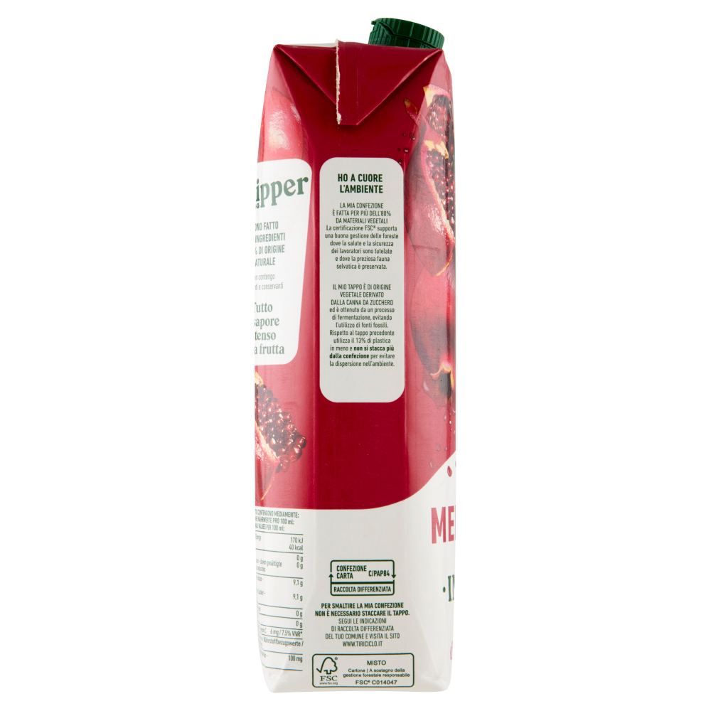 Sono fatto con ingredienti 100% di origine naturale Non contengo coloranti e conservanti Tutto il sapore intenso della frutta Ho a cuore l'ambiente La mia confezione è fatta per più dell'80% da materiali vegetali La certificazione FSC supporta una buona gestione delle foreste dove la salute e la sicurezza dei lavoratori sono tutelate e dove la preziosa fauna selvatica è preservata. Il mio tappo è di origine vegetale derivato dalla canna da zucchero ed è ottenuto da un processo di fermentazione, evitando l'utilizzo di fonti fossili. Rispetto al tappo precedente utilizza il 13% di plastica in meno e non si stacca più dalla confezione per evitare la dispersione nell'ambiente.