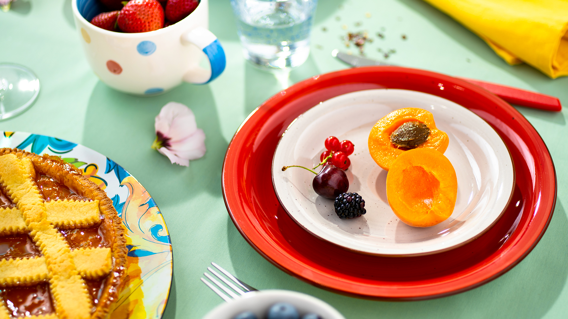 E non dimenticare tovaglioli e piatti da portata, sceglili in contrasto con il tovagliato di fondo per farli risaltare. Ricordati però di giocare anche con altri elementi: distribuisci petali di fiori e della frutta accanto anche a piatti e bicchieri per dare il giusto tocco di eleganza. Servi anche dolci dall’aspetto appetitoso come una bella crostata alla marmellata e fai venire l’acquolina in bocca a tutti i tuoi ospiti.