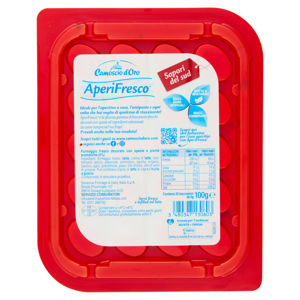 Le informazioni sono riferite esclusivamente al prodotto Camoscio d'Oro AperiFresco Sapori del Sud 100 g. Altri prodotti della stessa linea potrebbero differire dalle informazioni di seguito riportate.
